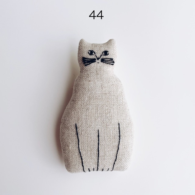 前足をきちんと揃えてお行儀よく佇む猫の姿は おりこうそのもの そんな姿をブローチにした「おりこうねこブローチ」がBigになっておりこう度がup! めっちゃおりこうになったのです! そう、MOKとはめっちゃおりこうの略、 MOKネコの誕生です! リネン生地に猫の刺繍を施しました。 ふっくらとしたブローチです。 -size- 約8.3㎝×4.5㎝ 厚さ約1.5cm(ピンを除く) -素材- 表側 リネン 刺繍糸 裏側 コットンリネン 中綿 ポリエステル ピン 真鍮