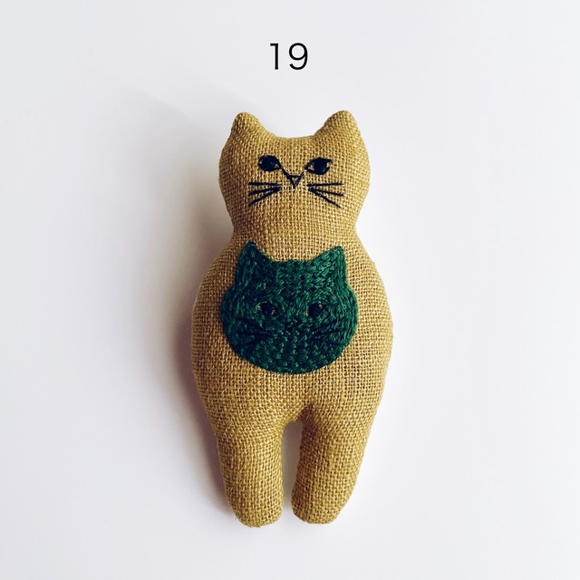 ネコが見てるよブローチ ねこは立ち止まりじっとあなたを見ています。 リネン生地に色んな猫の模様を思い浮かべて刺繍をしています。 窓がたくさんのビルディングみたいな模様のネコ 青いリボンでおしゃれしているcity cat! ふっくらとしたブローチです。 -size- 約5㎝×8㎝ 厚さ約1.6cm(ピンを除く) -素材- 表側 リネン 刺繍糸 裏側 コットンリネン 中綿 ポリエステル ピン 真鍮