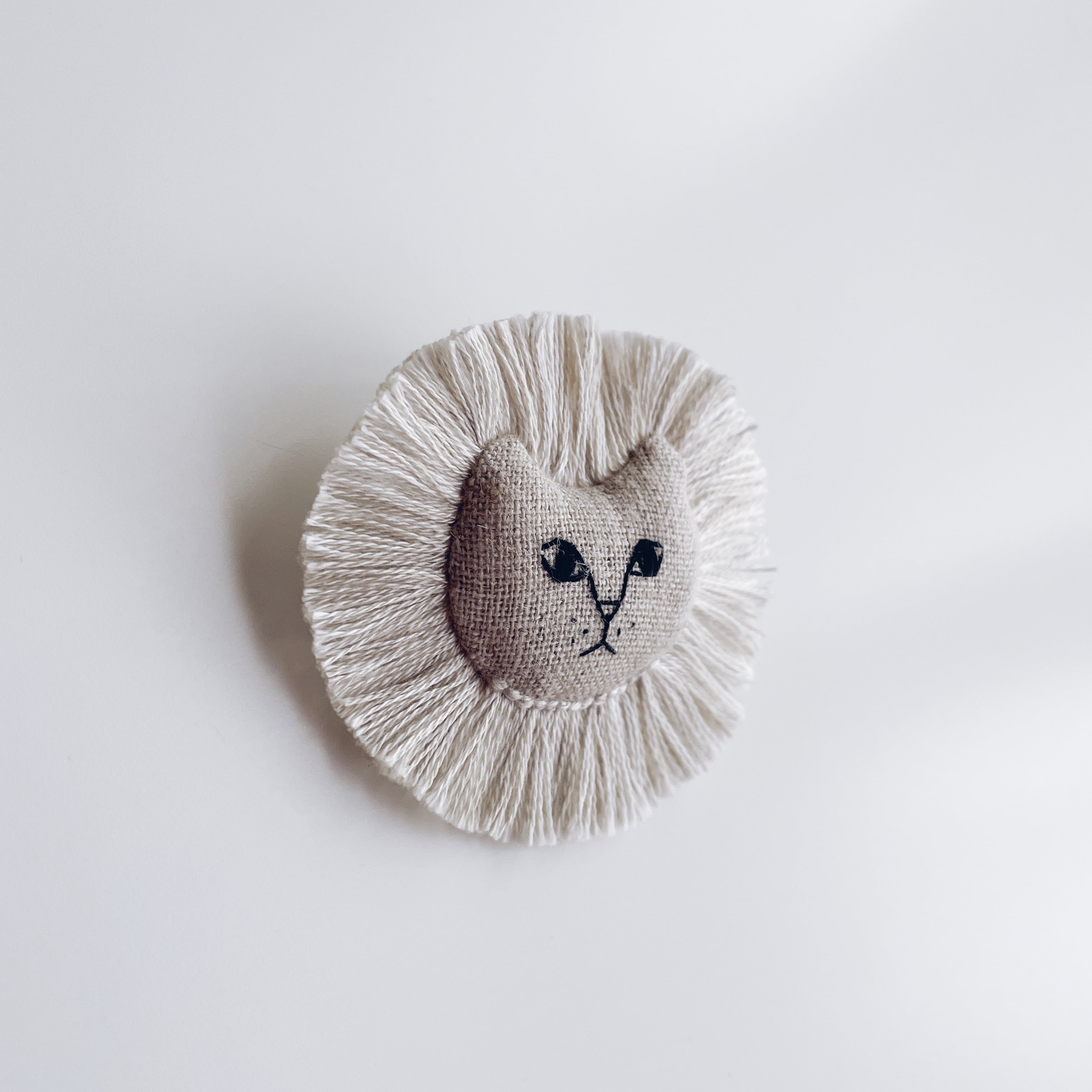 リネン生地にライオンの顔の表情が刺繍され、たてがみもこだわりの刺繍で再現し丁寧にカットしています。毛色は個性豊かにミックスされているため、どのブローチもユニークな仕上がりです。