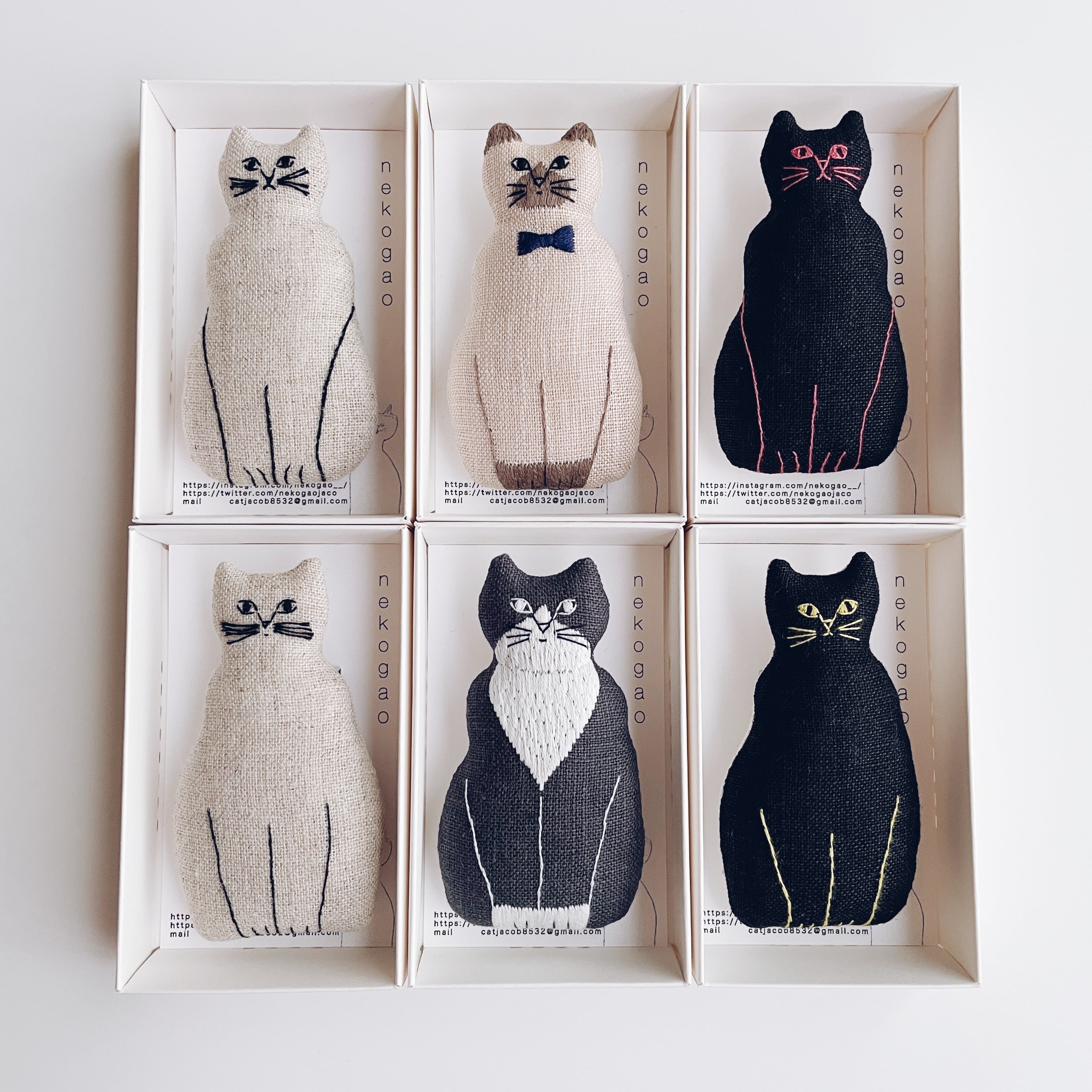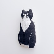 ダークグレーのリネン生地に白い模様を刺繍してはちわれ猫さんになりました。このタイプのネコの前掛けのような白い部分を触るのが大好きです!やたらとふわふわ♪