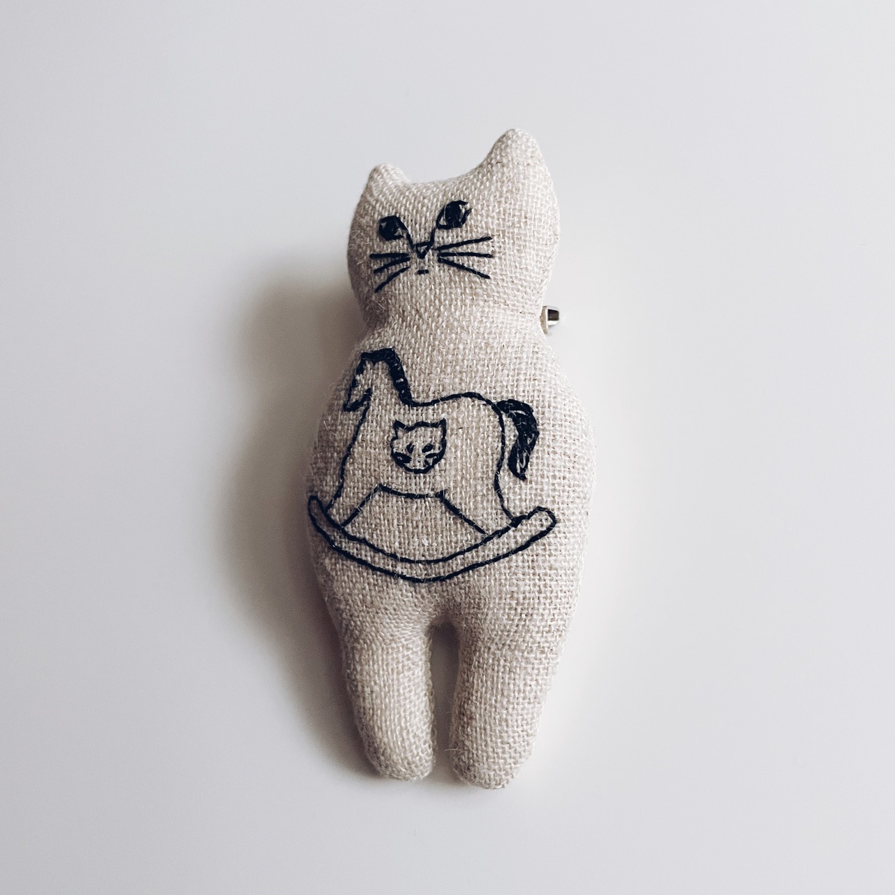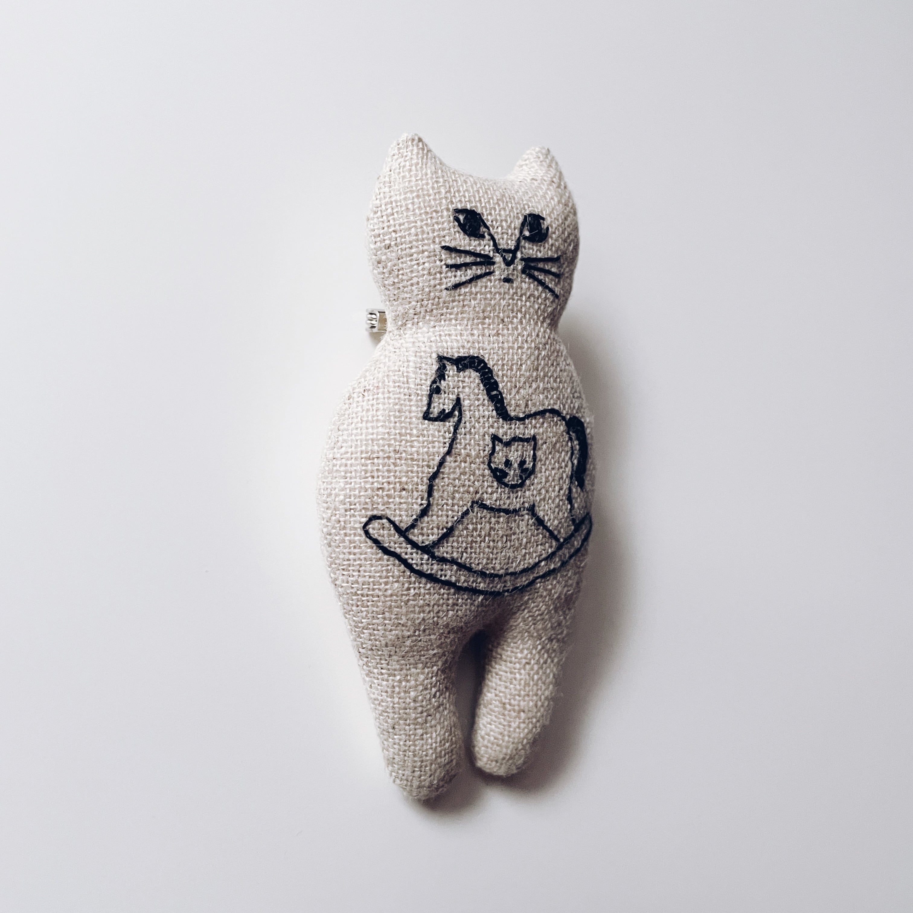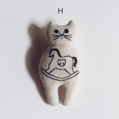 正面ネコブローチ ネコ模様の木馬 モノトーン H