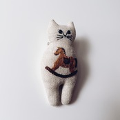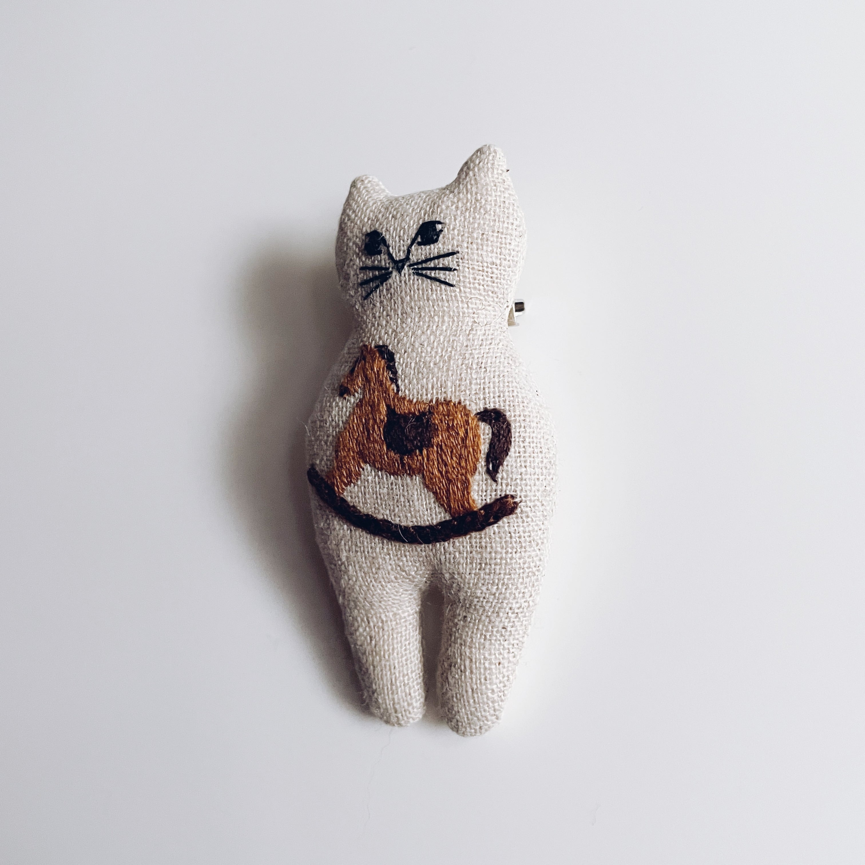 正面ネコブローチ ネコ模様の木馬 ブラウン I