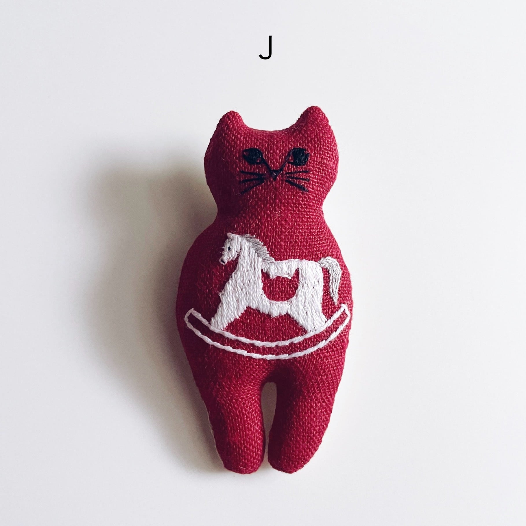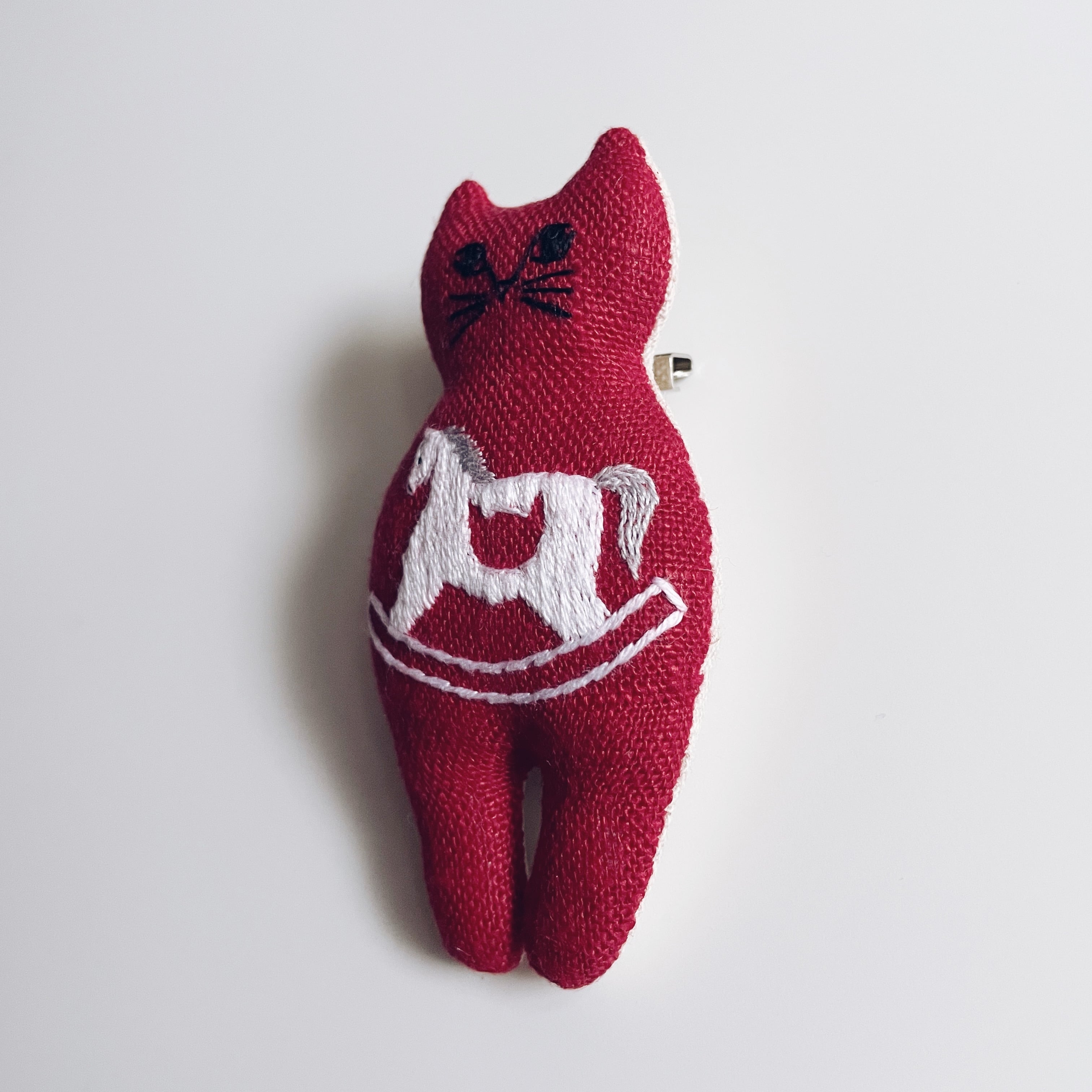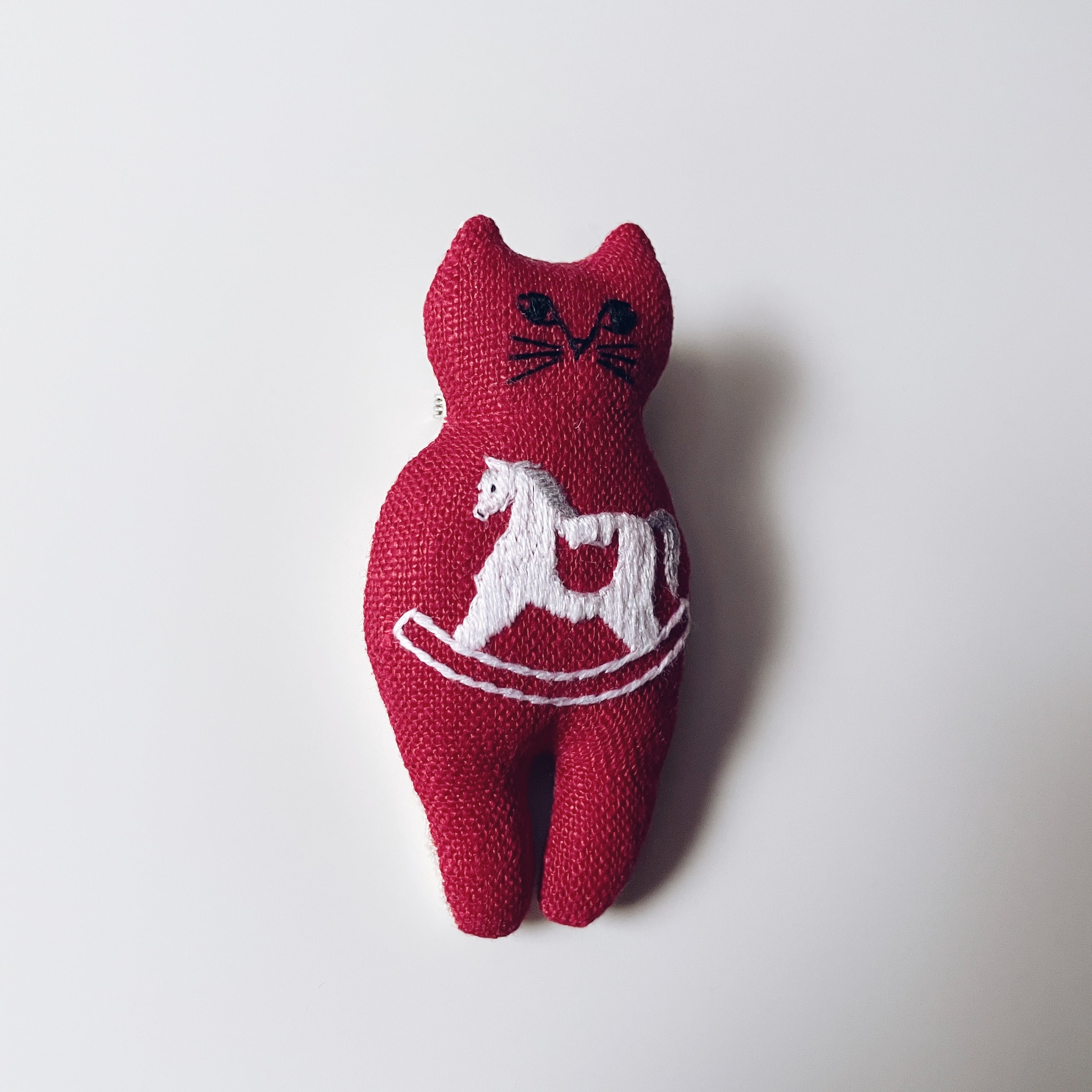 縁起の良い赤のリネン生地に木馬を刺繍しました