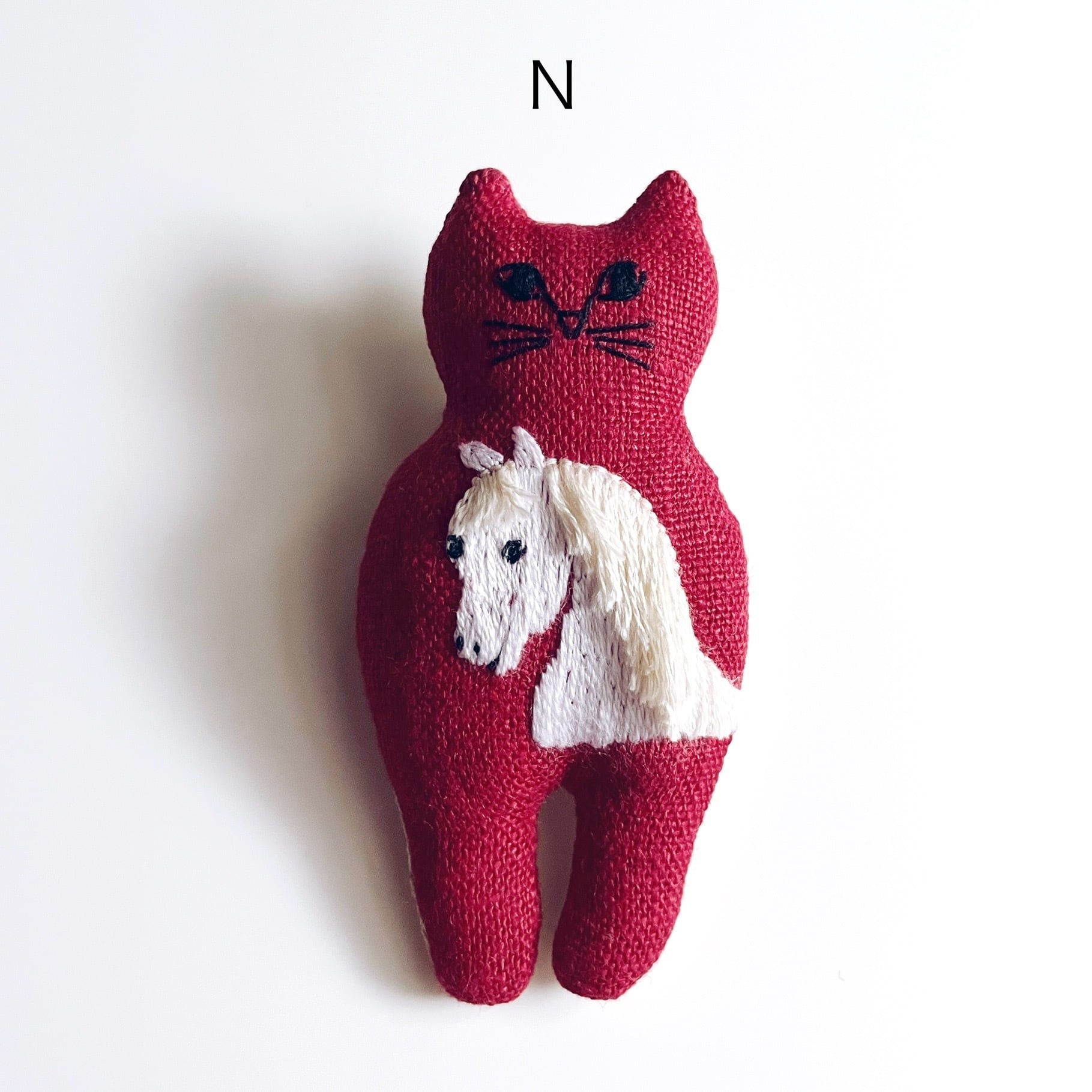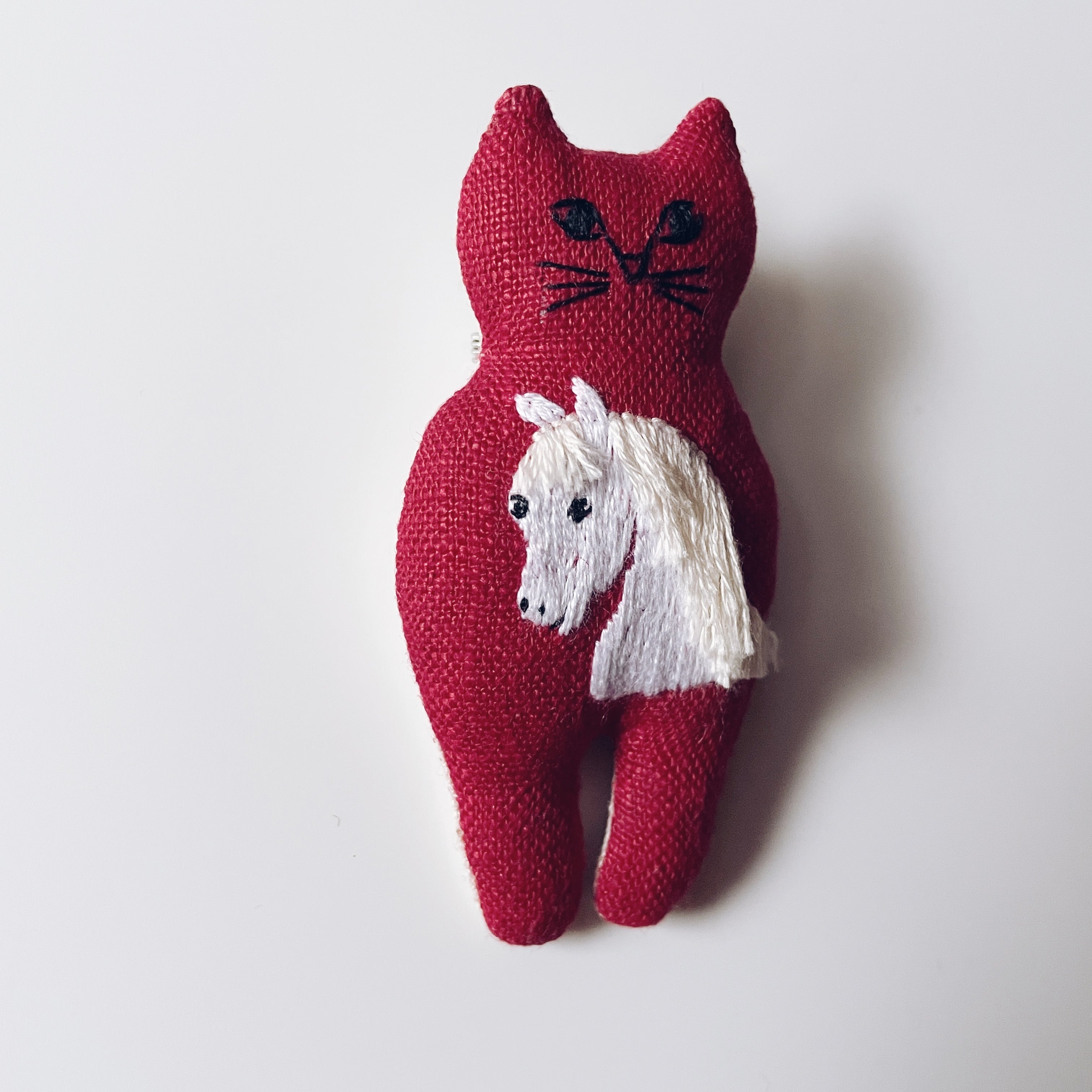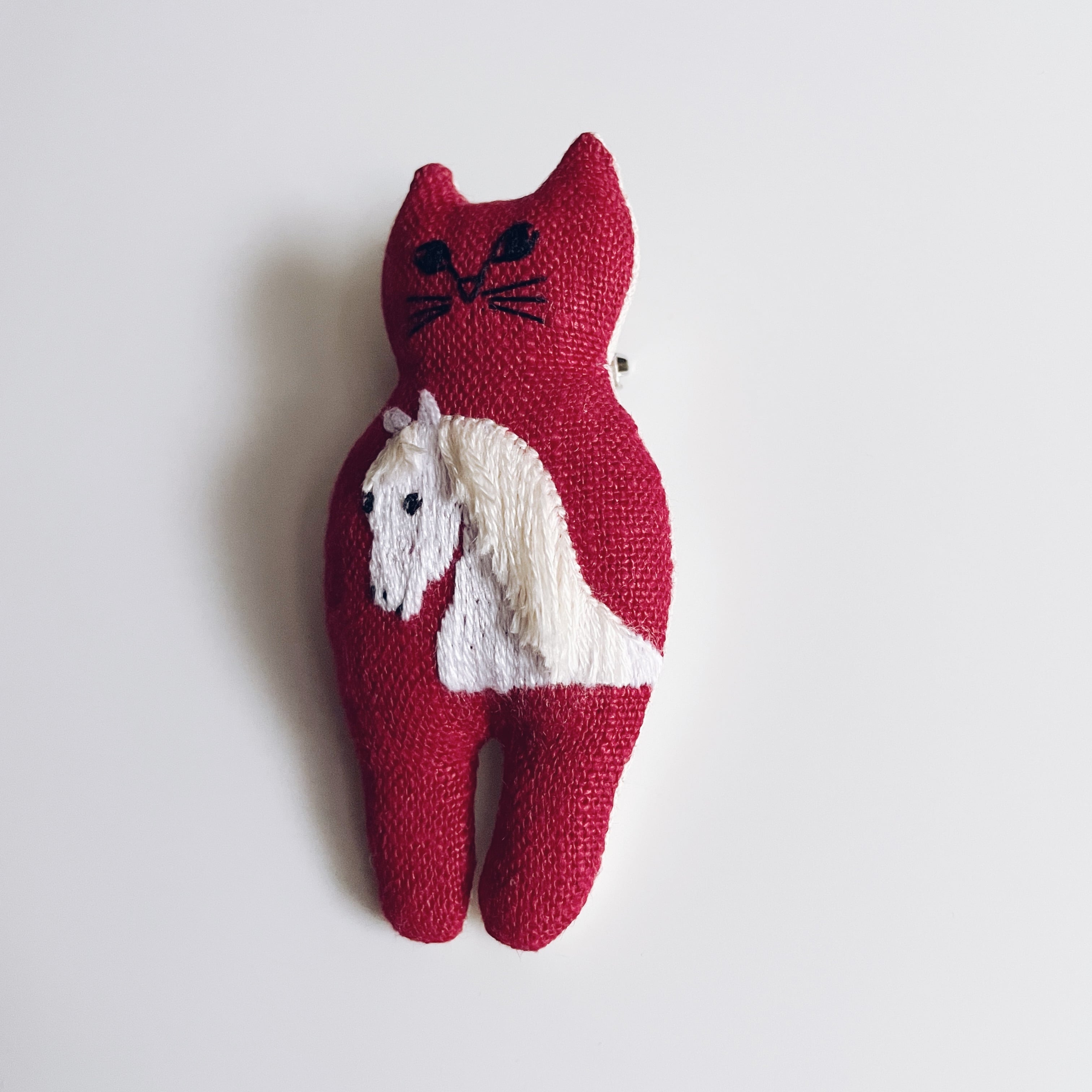 縁起の良い赤のリネン生地にふさふさ立て髪の馬を刺繍しました